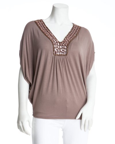 Ultra-chic and summer-fresh, this 2b top features V-neckline, faux-gem embellishments and metallic beaded detail. Oversized stretchy wear offers super chic appeal. Pair it with your favorite pair of hot denim. Center back to hem: 21".