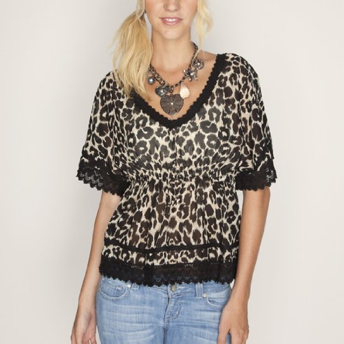 Chiffon top. Lightweight and sheer. Allover animal pattern. Crochet trim. Short dolman sleeves. Plunge v-neck. Smock waist. 100% polyester. Machine wash. Imported.