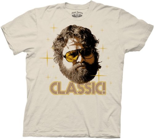 Alan from the hit comedy The Hangover is featured on this tan, 100% soft cotton t-shirt in a Las Vegas inspired graphic with the tagline, "Classic!" An awesome shirt for fans of The Hangover!