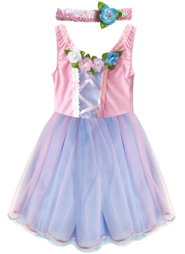 Dress up as your own princess with the My Princess Academy Pink and Blue Velvet Sleeveless Princess Dress. Ornately adorned pink stretch velvet bodice features layered pink opalescent sequins, pink satin ribbons criss-crossed over a blue stretch velvet inset and four multi-colored flowers at the neckline. The skirt features pink and blue tulle layered over a blue satin base and finished with a single row of pink opalescent sequins. Stretch bodice makes for easy on and off and a perect fit. Finish the look with a stretchy headwrap of sequins with a blue flower - beautiful!!