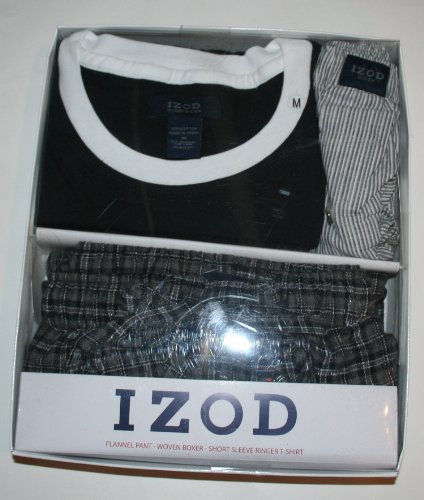 Izod Men's 3 Piece Pajama Set Size: Medium Black-Plaid-Stripe - Flannel Pant/Woven Boxer/Short Sleeve Ringer T-Shirt Flannel Pant; 100% on fly/open bottom/side seam pockets Short Sleeve Ringer T-Shirt: 100% cotton/1x1 rib contrast neck trim/contrast neck tape Woven Boxer; 100% cotton/1 button fly Machine Washable Made in China