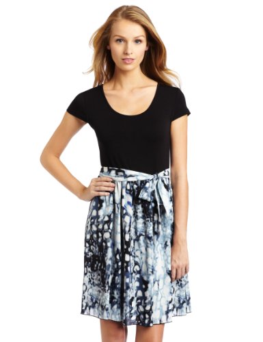 Summer day dress with a knit cap sleeve top and full printed woven skirt